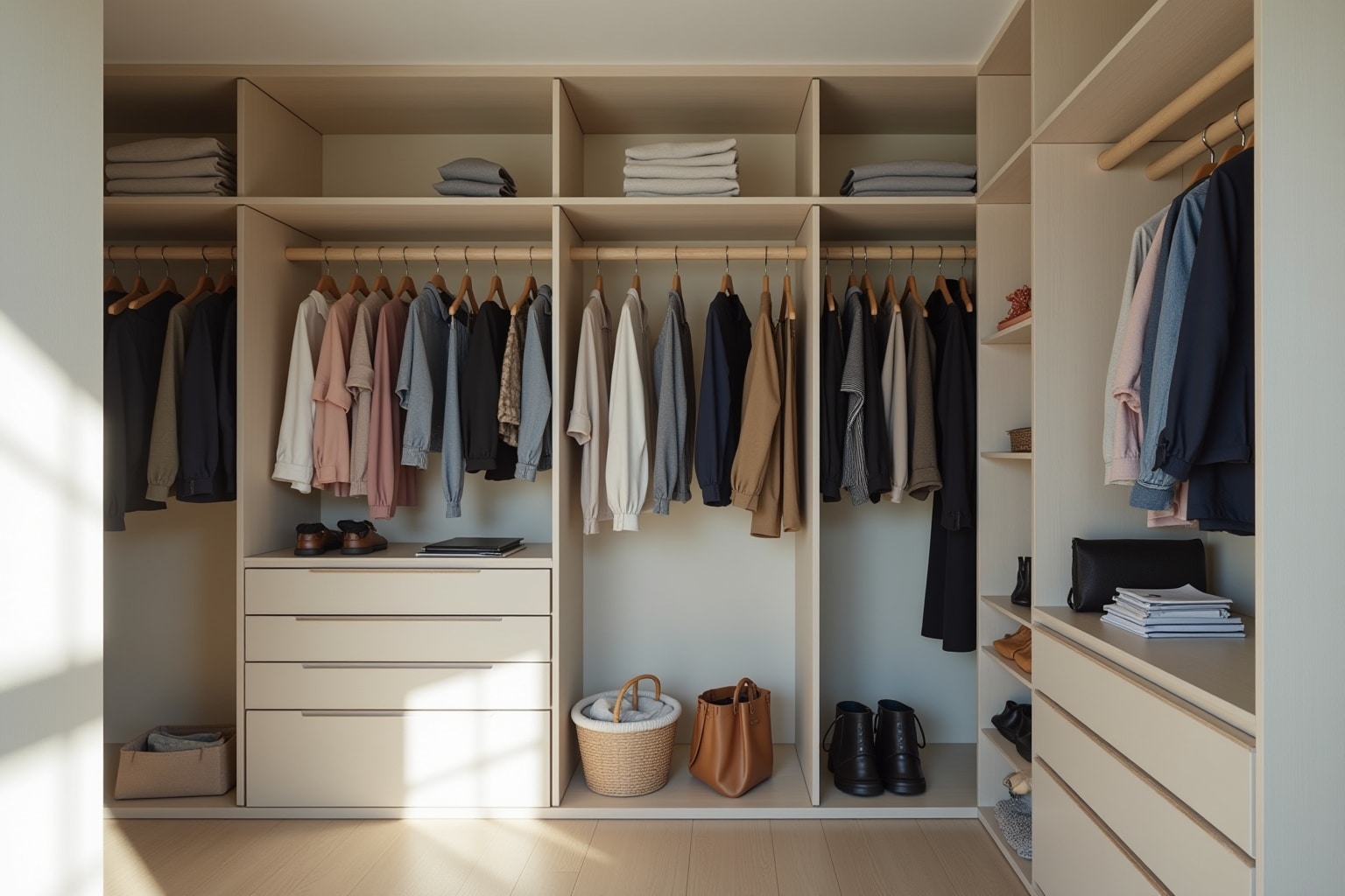 Welche Stauraumlösungen für dich am besten geeignet sind, hängt von der Größe und dem Schnitt deines Kleiderschranks ab. Hängeaufbewahrungen für Schuhe, Regaleinsätze für Taschen, Schubladenorganisatoren für Unterwäsche und Socken, Körbe und Boxen für kleinere Gegenstände sowie Haken und Kleiderleisten an den Innenseiten der Schranktüren sind jedoch immer eine gute Wahl. Probiere verschiedene Lösungen aus und finde heraus, was für dich am besten funktioniert.