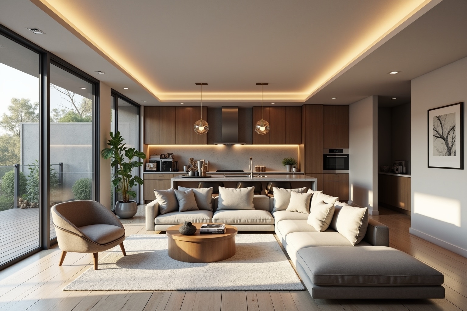 - Gleiche Bodenbeläge: Verwende für den gesamten offenen Wohnbereich den gleichen Bodenbelag, um ein harmonisches Gesamtbild zu schaffen.